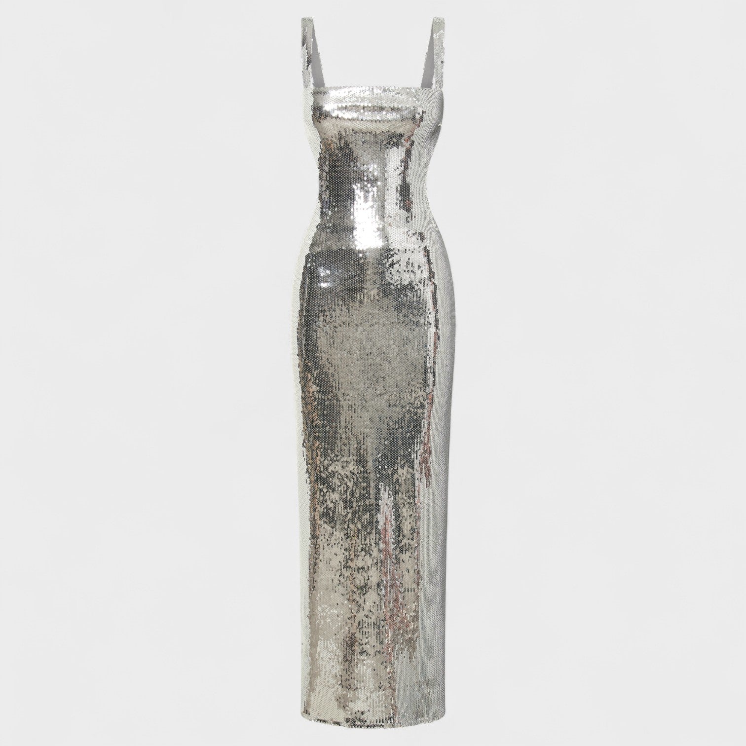 O vestido Gala Silver capta a atenção desde o primeiro momento. O seu tecido de lantejoulas cintilantes reflecte a luz com elegância, enquanto as fendas laterais enquadram a silhueta com sensualidade. Concebido para mulheres que se atrevem a brilhar em cada passo.